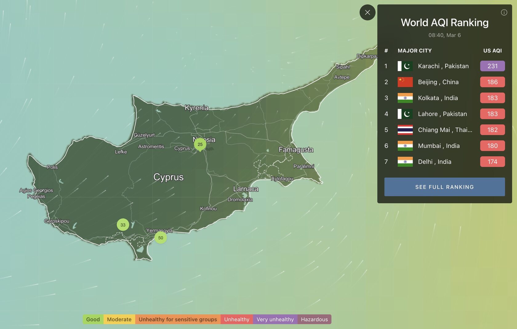 Τα δεδομένα PM2,5 αναφέρονται σε μικρογραμμάρια ανά κυβικό μέτρο (μg/m³) και χρησιμοποιούν τις τελευταίες ετήσιες κατευθυντήριες γραμμές για την ποιότητα του αέρα PM2,5 του Παγκόσμιου Οργανισμού Υγείας (ΠΟΥ) και τους ενδιάμεσους στόχους ως πλαίσιο για την οπτικοποίηση δεδομένων.