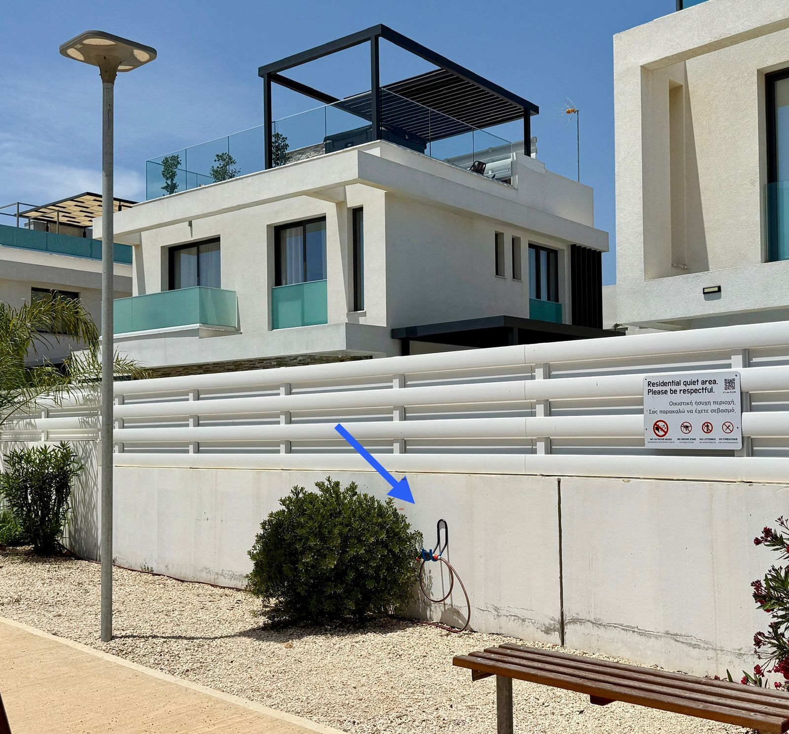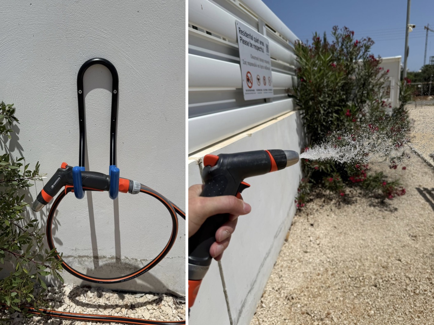 If you come back from the beach with sandy feet, you can wash them off before stepping into your house. The committee installed a hose with a nozzle in the front play area, utilizing our shared water connection.